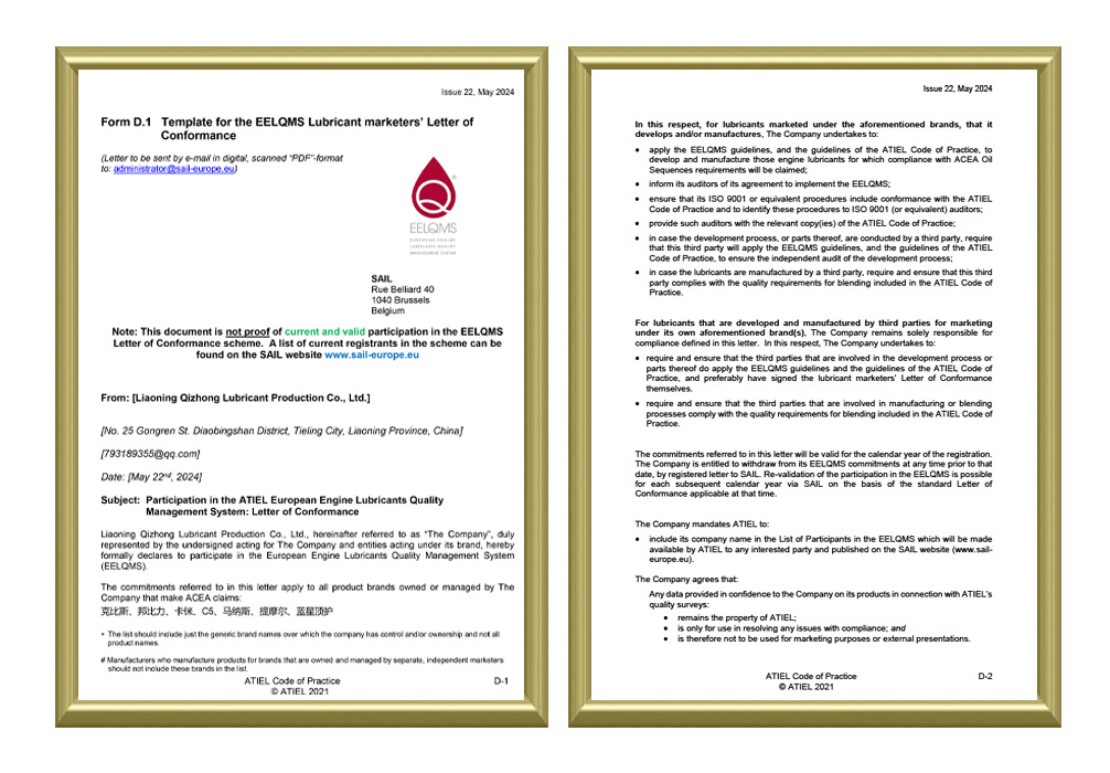 汽衆集團作爲中國高質量潤滑油的生産代表,於 2024 年自願加入 EELQMS體系,旗下“馬納斯”“C5”“卡侎”“藍星頂護”“邦比力”等品牌産品标簽上已體現出 EELQMS 紅色水滴形标識,意味著産品質量完全跻身國際大品牌的行列!未來,集團将不斷引進當前世界先進的潤滑制造技術及标準,打造更高端的潤滑油品牌! 歐洲發動機潤滑油團量管理體系(EELQMS)是唯一可用於支持針對ACEA油類要求聲明的質量體系,隻有通過該體系才可将ACEA聲明包含在産品标簽中。
